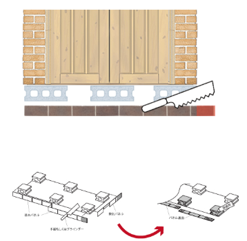 物置の下に並んだ基礎ブロックをパネルで覆うだけで