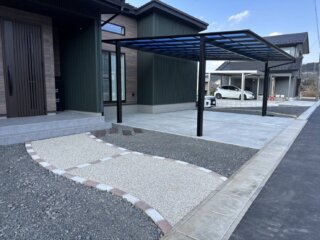 また、最近では、デザイン土間の駐車スペースも人気です。コンクリートは伸縮するため、広く打つと段々ひび割れなどが起こっていきます。自然現象なので、仕方のない部分ではありますが、それを少しでも防ぐために、目地という、隙間のあいたラインを先に作っておきましょう。それにより、コンクリートのスペースを区切り、小さくして割れを防いでいきます。そんな目地を真っ直ぐのラインではなく、曲線で作る、隙間に植物やレンガなどを入れると、どうでしょう!それだけでとても雰囲気が変わるとは思いませんか?機能性もあり、見た目もおしゃれな目地にこだわってみると、殺風景だった駐車場が見違えるはずです。さらに、石張りやタイルなどをポイントで入れ、アレンジを加えてみると、それこそ、世界にひとつだけの、素敵な駐車スペースが出来上がることでしょう。