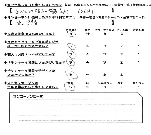 この度は数ある業者の中からサンガーデンエクステリアにご依頼いただき、誠にありがとうございました。大切なご家族の新たな暮らしにカーポート設置という形で関わることができ、大変光栄に思っております。今後とも何かございましたら、どうぞお気軽にご相談ください。