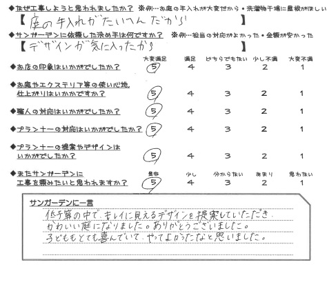 この度はサンガーデンエクステリアにご依頼いただき誠にありがとうございました。お客様のご希望に添えた工事を行うことができてとても嬉しく思います。お庭の手入れが容易にすっきりと良いお庭になったと思います(^^♪また何かございましたらお気軽にご相談いただけると幸いです。