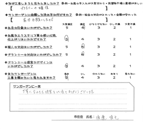 この度は再度サンガーデンエクステリアにご依頼いただきありがとうございます。再度工事のご依頼をいただきとても嬉しく思います。今回の工事では目隠しによりプライバシーの確保がきちんととれた空間になったと思います。また何かございましたらお気軽にご相談いただけると幸いです。これからも末永くよろしくお願い致します。