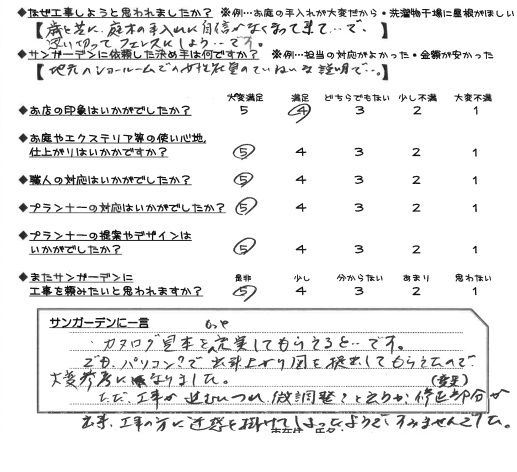 この度はサンガーデンエクステリアにご依頼いただき誠にありがとうございました。工事の際に気になることが出てくるようでしたら職人さんや担当者の方に何なりとお申し付けください。また何かございましたらお気軽にご相談いただけると幸いです。