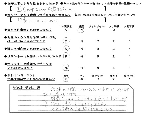 ご感想ありがとうございます。芝生のお手入れが大変だったとのことでご相談をいただきましたが、仕上がりやプランを気に入っていただけたようで、スタッフ一同とても嬉しく思っております。これから季節が変わる中で、お庭の使い方やメンテナンスで気になることがありましたら、いつでもご連絡ください。今後ともよろしくお願いいたします。