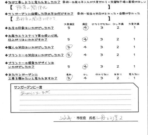 この度はサンガーデンエクステリアにご依頼いただきありがとうございました!ホームページをご覧いただき、ご相談いただけてとても嬉しく思います。少しでもお力になれていれば幸いです。何か気になることやご相談がありましたら、いつでもお気軽にご連絡ください。今後ともどうぞよろしくお願いいたします。