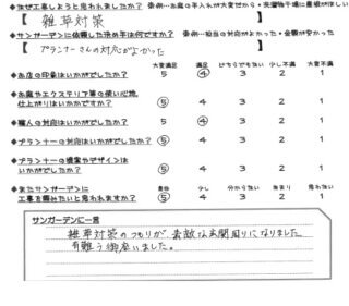 この度はサンガーデンエクステリアにご依頼いただき、ありがとうございました!仕上がりにご満足いただけたとのことで、とても嬉しく思います。また何がお困りのこと等出てきましたら、いつでもご連絡ください。ご感想ありがとうございます。今後ともよろしくお願いいたします。
