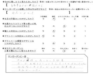 この度はサンガーデンエクステリアに工事をご依頼いただき、ありがとうございました。担当者の対応を評価していただき、安心してお任せいただけたことをうれしく思います。価格について率直なご意見もいただき、今後の参考にさせていただきます。再びお手伝いできる機会を楽しみにしております。お客様に寄り添った提案と丁寧な対応を心がけ、これからも満足していただける施工を目指してまいります。