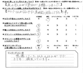 このたびはサンガーデンエクステリアに工事をご依頼いただき、誠にありがとうございました。お庭の手入れにお悩みの中、私どもの提案や対応を信頼してお任せいただけたこと、大変光栄に思っております。プランナーや職人の対応、仕上がりにつきましても高い評価と「想像以上」とのお言葉を頂戴し、スタッフ一同大きな励みとなりました。これからも快適にお庭をご活用いただけましたら幸いです。今後とも末永いお付き合いをよろしくお願いいたします。