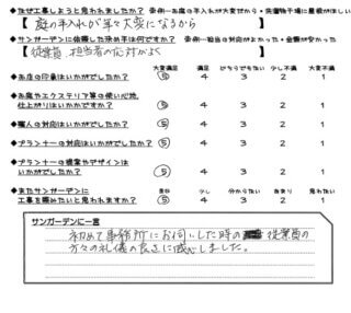 お庭のお手入れを考えられる中で工事をご検討され、また従業員や担当者の応対をきっかけに弊社へご依頼いただけたこと、大変うれしく思っております。初めて事務所へお越しいただいた際の対応についても温かいお言葉を頂戴し、スタッフみんなで嬉しく拝見しました。今後も気持ちよくお付き合いいただけるよう、丁寧な対応と安心できる工事を心がけてまいります。ご感想ありがとうございます。