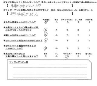 この度はサンガーデンエクステリアにご依頼いただき、誠にありがとうございました!車庫が必要になったとのことで、お使いいただきやすいようなプランをご提案させていただきました。担当者の対応が良かったと感じていただけて大変嬉しく思います。また何かございましたらいつでもご連絡ください。今後ともよろしくお願いいたします