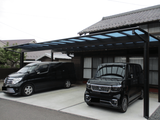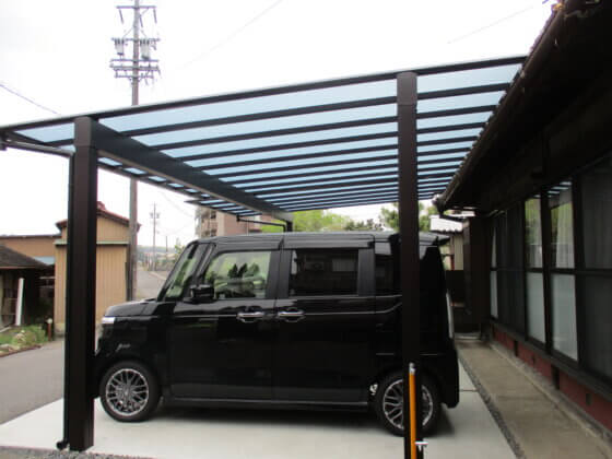 ブロックとフェンスで囲われていたお庭を駐車場にしてカーポートを設置するご依頼をいただきました。屋根は光を通してくれるポリカーボネート製ですので明るく開放的な駐車スペースに仕上がったと思います。敷地内にカーポートが納まってくれるように屋根の長さに段差をお付いたしました。元々あった井戸をオシャレな立水栓にして駐車の邪魔になる事が無いようにいたしました。広々とした駐車スペースにスタイリッシュなカーポートがお家に良く似合っています。ご依頼頂きありがとうございました。
