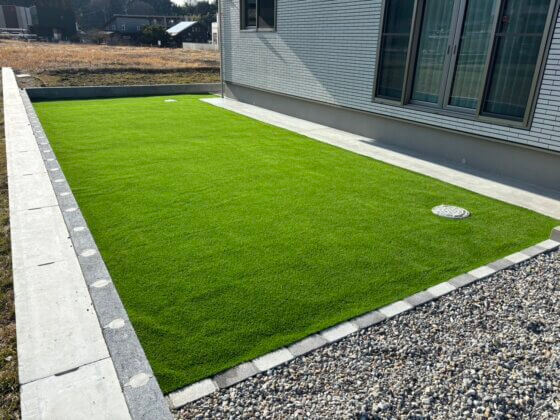 水が溜まる土地でしたので、暗渠パイプの埋め込みやアスファルト舗装、防草シートと砂利敷きをしました。お庭の辺りでは、子供さんが外で元気いっぱい遊べるような空間が欲しいと言う事で人工芝を敷き、緑が映える素敵なお庭になりました。一部、ブロック積みが必要でしたのでブロックを積みをし、アスファルト勾配を取りました。裏側は、雑草対策で防草シートと砂利敷きをしました。施工前と比べるととても綺麗になり、お庭らしい雰囲気になりました。ご依頼頂きありがとうございました。